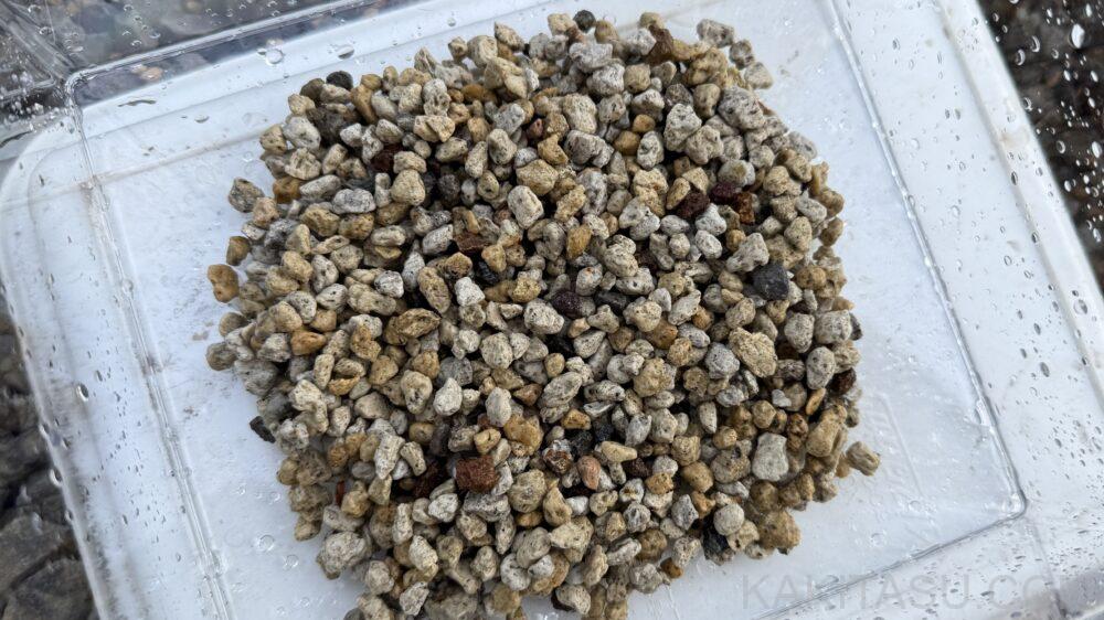 水槽を水道水で軽くすすいで小粒の軽石を水槽の中央に敷き詰めました。軽石はソイルで隠れるよう側面にスペースを確保しています。